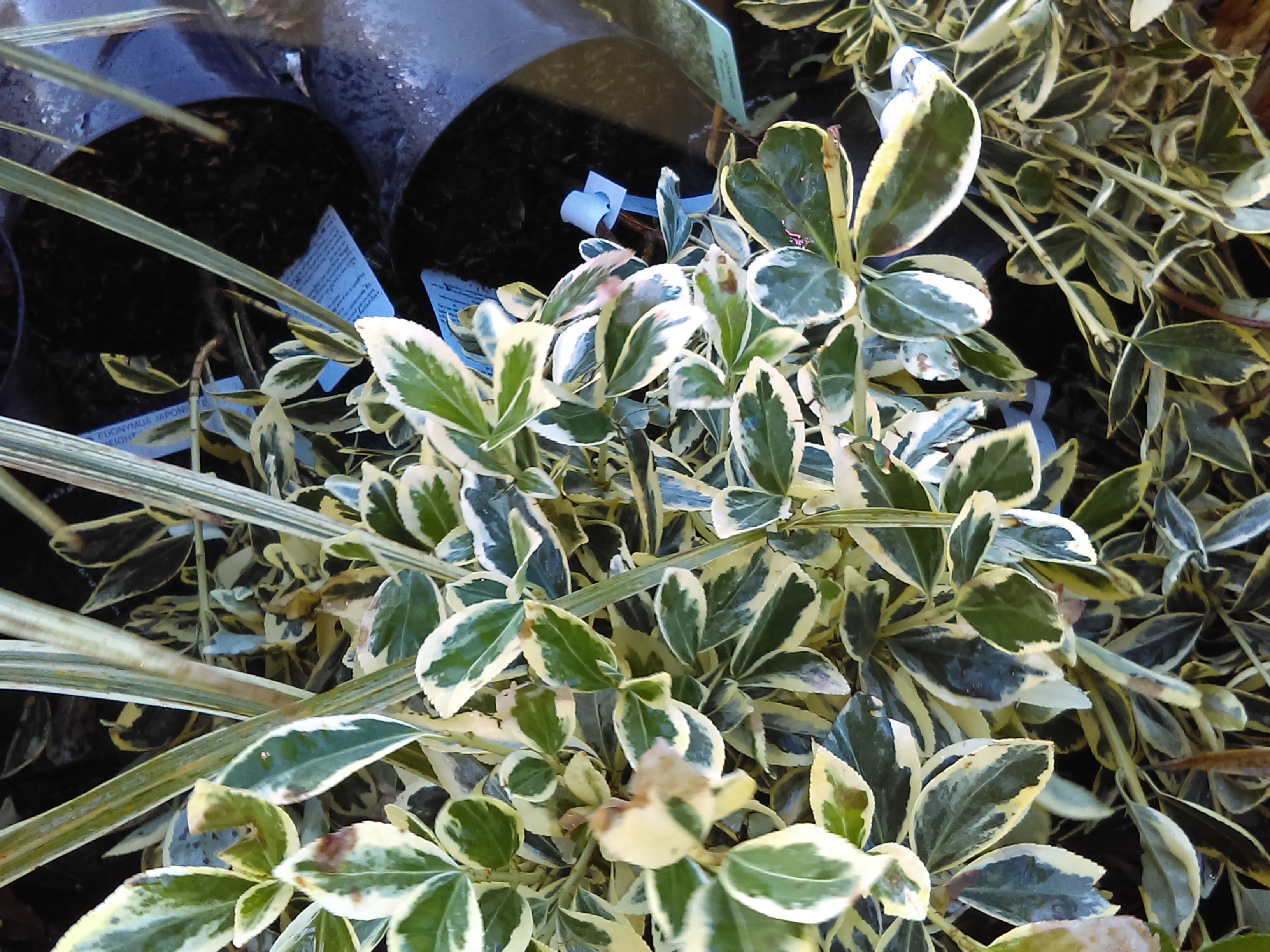 An evergreen shrub with with glossy green leaves with a cream margin.
